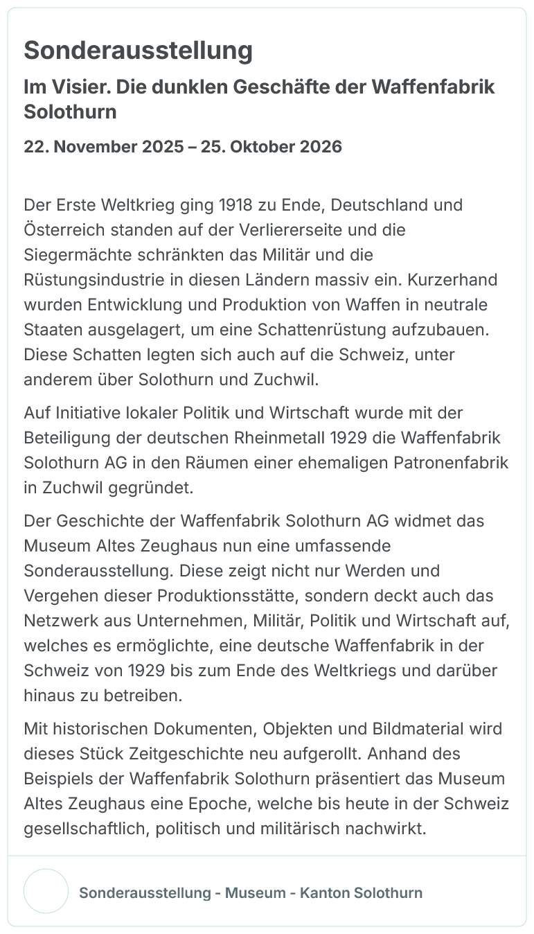 «Das Museum Altes Zeughaus in Solothurn zeigt bis 31. Oktober 2026 die Sonderausstellung «Im Visier. Die dunklen Geschäfte der Waffenfabrik Solothurn». Nach dem Ersten Weltkrieg lagerten Deutschland und Österreich die Entwicklung und Produktion von Waffen ins neutrale Ausland aus. 1929 gründeten Solothurner Wirtschafts- und Politikexponenten die Waffenfabrik Solothurn AG mit Beteiligung der deutschen Rheinmetall. Die Sonderausstellung über die Geschichte der Waffenfabrik und ihrer Produkte zeigt vor allem auch das Netzwerk von Unternehmen, Militär und Politik auf, das den Betrieb einer deutschen Waffenfabrik in der Schweiz von 1929 bis 1945 und darüber hinaus erlaubte.» [RS]
